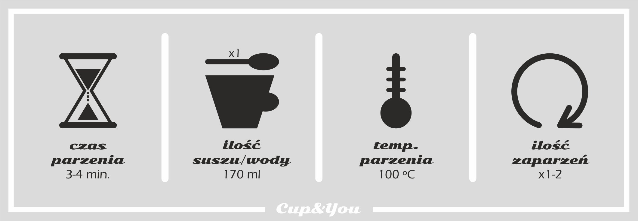 Parzymy wrzątkiem (100° C), 3-4 minuty (w zależności od upodobań związanych z intensywnością naparu), 1 łyżeczka suszu na 170ml wody (mała filiżanka).