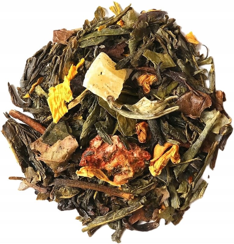 Herbata zielona z dodatkami, sypana, w specjalnym pojemniku:
