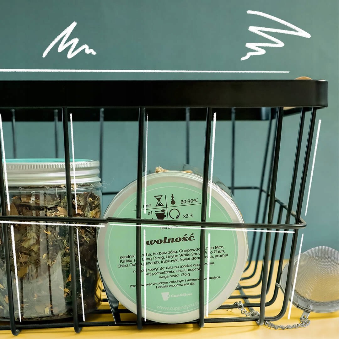 - Etykieta na pojemniku z wszystkimi ważnymi informacjami, m.in. sposobie parzenia i składzie