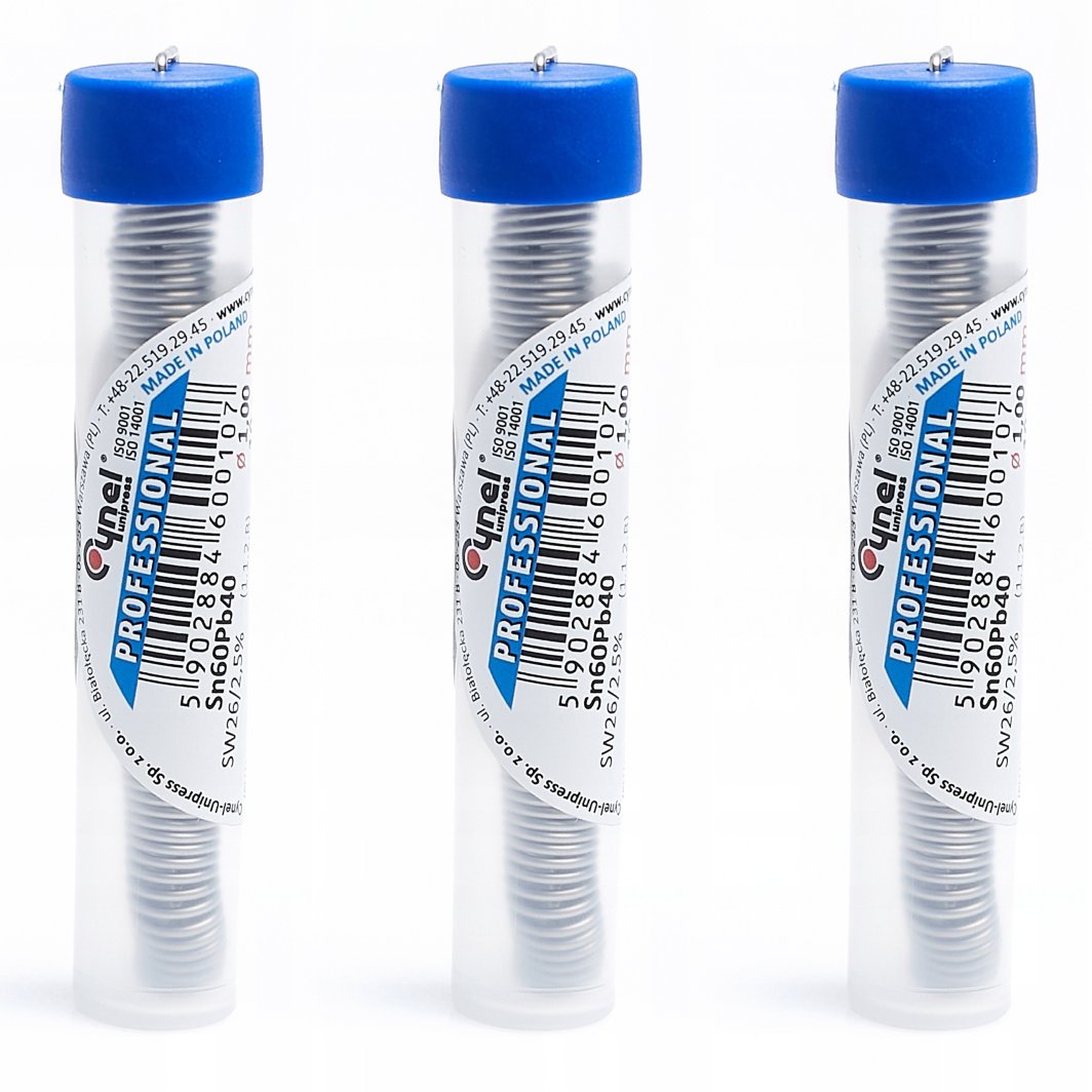 Cyna do lutowania z topnikiem 2,5% ołowiowa S-Sn60Pb40 Cynel to materiał lutowniczy najwyższej jakości, który z pewnością zadowoli zarówno profesjonalistów, jak i pasjonatów elektroniki. Dzięki praktycznemu opakowaniu, które zawiera trzy fiolki po 16g, cyna jest łatwa w użyciu i przechowywaniu, co czyni ją doskonałym wyborem dla każdego, kto zajmuje się lutowaniem.