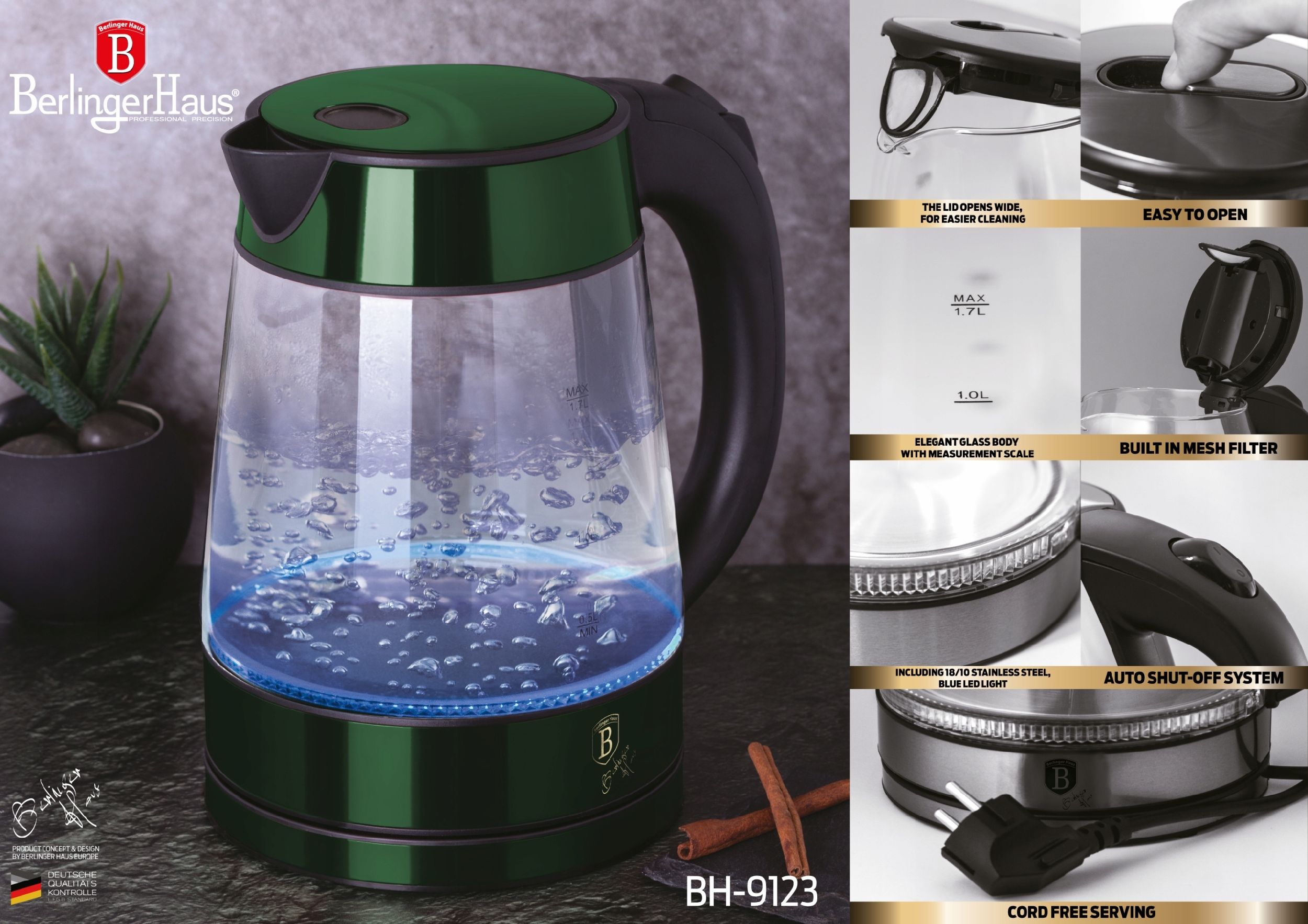 Zbiornik na wodę posiada praktyczną skalę pomiarową. W przypadku uruchomienia pustego urządzenia system automatycznego wyłączenia urządzenia sprawi, że grzałka czajnika automatycznie się wyłączy. Czajnik ma wbudowany filtr oraz obrotową podstawkę 360° Moc do 2200 W znacznie skraca czas gotowania wody, dzięki czemu zaparzymy poranną kawę bądź herbatę jeszcze szybciej. Eco-Friendly Produkty Berlinger Haus nie posiadają w swoim składzie związków PFOA, kadmu i niklu. Dzięki czemu są bezpieczne zarówno dla zdrowia jak i środowiska.
