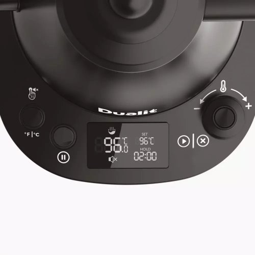 Jedną z najważniejszych cech czajnika Dualit jest możliwość regulacji temperatury w zakresie od 38 do 100°C. Dzięki temu możesz dostosować temperaturę do różnych rodzajów kawy i herbaty, co pozwala na wydobycie pełni ich smaku i aromatu. Elektroniczny ekran wyświetla aktualne ustawienia, co ułatwia korzystanie z urządzenia.
