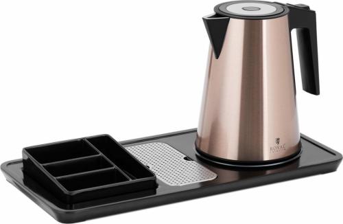 Czajnik elektryczny marki Royal Catering sprawdzi się w pokojach hotelowych, socjalnych czy w recepcji. Duża moc czajnika 1800 W pozwala zagotować 1,2 l wody w 3 minuty. Czajnik automatycznie wyłącza się. Zintegrowana tacka ociekowa z miejscem na kawę i herbatę pozwala wygodnie przygotować ulubiony napój. Czajnik wykonany został ze stali nierdzewnej, jest higieniczny, trwały i łatwy w czyszczeniu.