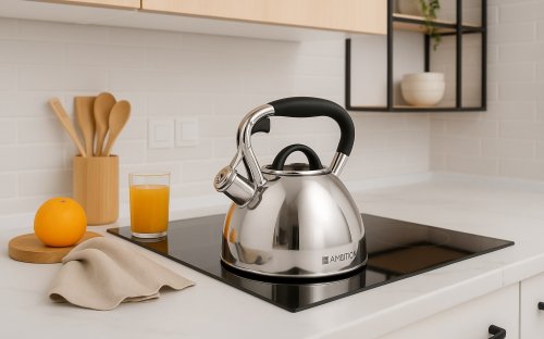 „Czajnik stalowy Ambition Octavio 2,3 l z gwizdkiem – elegancki, trwały i bezpieczny. Odpowiedni na indukcję, gaz, ceramikę i kuchenkę elektryczną.”