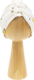 Turban wykonany z kremowej bawełny w motyw cytrynek. Falbanka z przodu nadaje czapeczce dziewczęcego stylu, od środka podszyta jest kremową bawełną z niewielką ilością elastanu, co sprawia, że czapka nie odkształca się i dobrze dopasowuje do główki dziecka. Materiał posiada certyfikat Oeko-Tex Standard 100 Tekstylia godne zaufania.