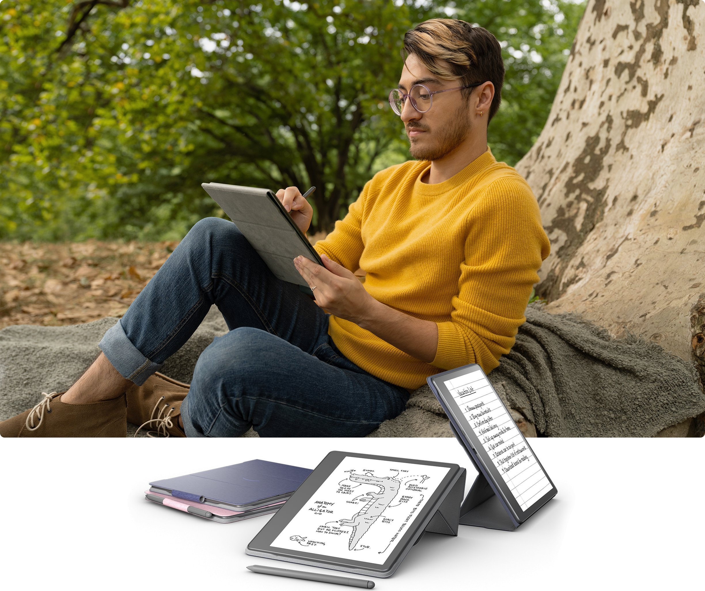 Zaprojektowane specjalnie dla Kindle Scribe, te smukłe, dopasowane okładki mocują się bezpiecznie i można je złożyć do dwóch pozycji do czytania. Automatycznie usypiają Kindle po zamknięciu i budzą po otwarciu, ułatwiając powrót do czytania i pisania. Dowiedz się więcej o naszych okładkach . Dostępne są również wymienne końcówki do pióra.