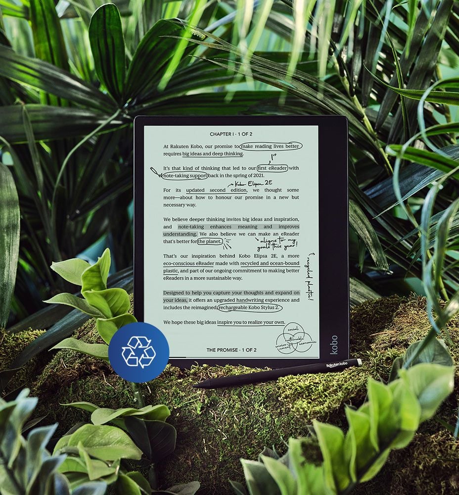 Realizując jedno z naszych zobowiązań dotyczących użycia bardziej nowoczesnych materiałów w produkcji czytników elektronicznych, wykonaliśmy urządzenie Kobo Elipsa 2E z plastiku i odzyskanego przed wyrzuceniem do oceanu oraz przetworzonego stopu magnezu. Opakowanie także jest bardziej funkcjonalne.
