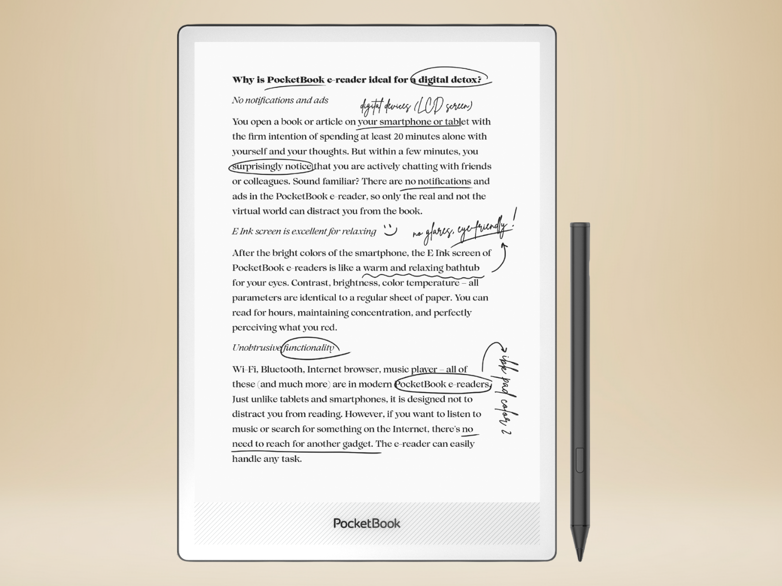 PocketBook InkPad One obsługuje rysik PocketBook Stylus 2 dołączony w zestawie, który pozwala wygodnie pracować z tekstem bezpośrednio na ekranie. Możesz podkreślać fragmenty, dopisywać odręczne notatki oraz zaznaczać ważne informacje na stronach dokumentów i e-booków. To praktyczne rozwiązanie podczas czytania książek non-fiction, materiałów naukowych, raportów czy plików PDF, gdzie liczy się szybkie nanoszenie uwag bez przerywania lektury.