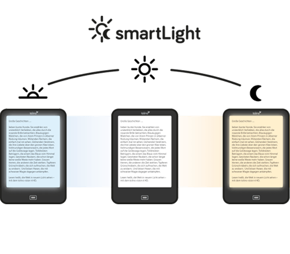 Dla wszystkich, którzy lubią czytać przed pójściem spać, opracowaliśmy smartLight! Nowy komfortowy czytnik eReader Tolino smartLight zapewnia optymalne światło do czytania. Temperatura barwowa zintegrowanego światła automatycznie dostosowuje się do pory dnia i zmienia się wraz z światłem dziennym, od chłodnego białego światła rano do ciepłego białego światła wieczorem.