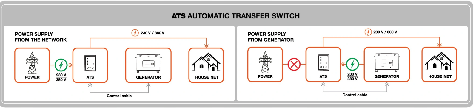 W przypadku zaniku zasilania lub spadku napięcia w sieci podstawowej moduł uruchamia agregat prądotwórczy. Po wznowieniu dostarczania energii elektrycznej następuje przełączenie powrotne na tor zasilania podstawowego, a agregat zostaje wyłączony i przechodzi w tryb czuwania. Moduł także stale monitoruje napięcie akumulatora rozruchowego agregatu i w razie potrzeby załącza ładowanie. Urządzenie posiada wygodne montażowe uchwyty ścienne oraz solidną, metalową obudowę zamykaną na klucz.