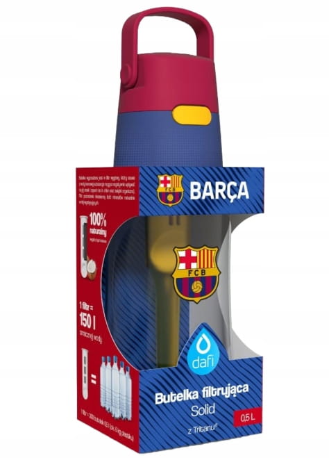 Butelka filtrująca Dafi SOLID FC Barcelona 0,5 l to wyjątkowe połączenie nowoczesnej funkcjonalności i pasji do piłki nożnej. Z dumą prezentuje herb kultowego klubu FC Barcelona i została zaprojektowana z myślą o fanach sportu oraz osobach dbających o zdrowie i nawodnienie.