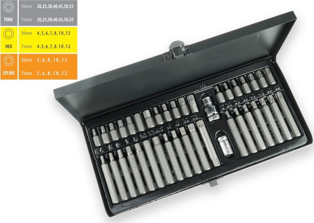 Zestaw 40 szt. końcówek wkrętakowych. W skład zestawu wchodzą Końcówki TORX, HEX oraz SPLINE w długości 30 i 75mm. Końcówki wykonane zostały z wytrzymałej stali chromowo wanadowej, która gwarantuje końcówkom odpowiednią trwałość i odporność na korozję. Całość zamknięta w metalowej poręcznej walizce.