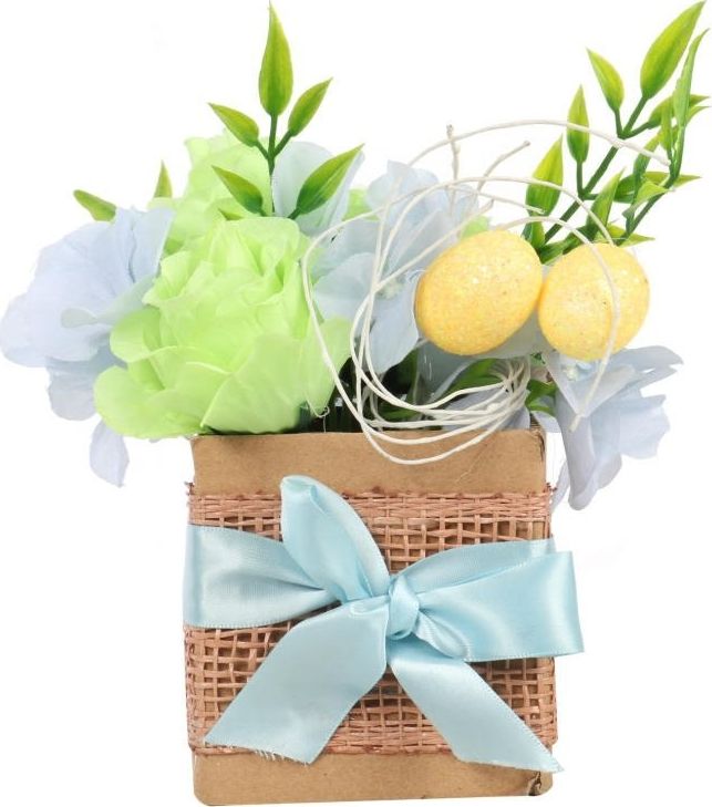 Wyjątkowy stroik wielkanocny z jajeczkami - FLOWER BOX. Kompozycja została ręcznie wykonana z dobrej jakości kwiatów. Podstawa kartonowa przepasana siatką jutową oraz jedwabną tasiemką w kolorze niebieskim