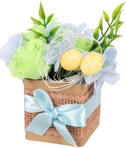 Wyjątkowy stroik wielkanocny z jajeczkami - FLOWER BOX. Kompozycja została ręcznie wykonana z dobrej jakości kwiatów. Podstawa kartonowa przepasana siatką jutową oraz jedwabną tasiemką w kolorze niebieskim