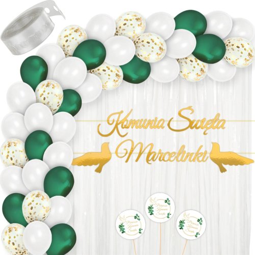 W skład zestawu wchodzi 46 balonów w eleganckich odcieniach zieleni, bieli i złota, które doskonale wpasują się w tematykę komunijną. Personalizowany baner z imieniem solenizanta oraz biała kurtyna stanowią świetne tło do zdjęć, a toppery do tortu dodają wyjątkowego charakteru każdemu wypiekowi. Dzięki tym dekoracjom stworzysz niezapomniane wspomnienia.