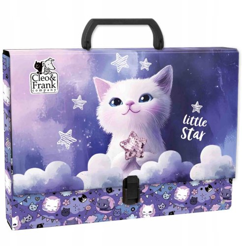 Teczka z rączką Cleo i Frank to znakomity wybór dla każdego dziecka, które potrzebuje miejsca na swoje prace plastyczne, zeszyty oraz dokumenty. Dzięki wygodnej rączce, teczka jest łatwa do przenoszenia, co czyni ją idealnym towarzyszem zarówno w szkole, jak i w domu.