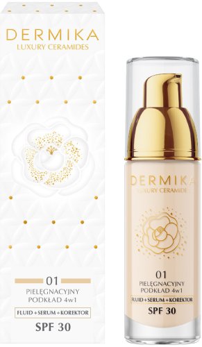 Podkład pielęgnacyjny Dermika Luxury Ceramides 4w1 w odcieniu 01 to nowoczesny produkt, stworzony z myślą o dojrzałej skórze kobiet. Oferuje wyjątkowe połączenie czterech funkcji: fluidu, serum, korektora oraz ochrony przeciwsłonecznej SPF 30. Dzięki temu stanowi doskonałe rozwiązanie dla osób poszukujących kompleksowej pielęgnacji i makijażu w jednym.