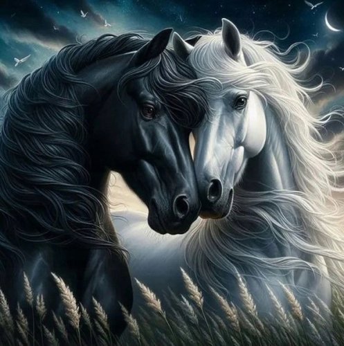 Obraz ukazuje dwie majestatyczne głowy koni, które kontrastują ze sobą niczym dzień i noc. Splecione w nastrojowej scenerii, z subtelnym światłem i dynamicznymi grzywami, tworzą romantyczny, baśniowy klimat, który wprowadza do wnętrza magię i elegancję.
