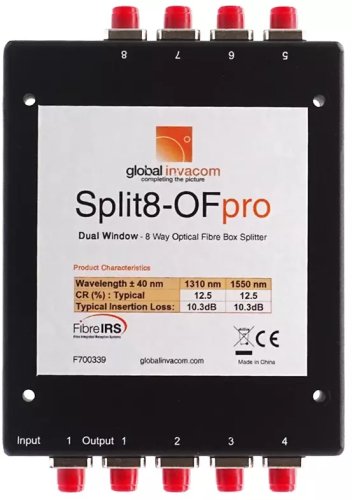 Global Invacom Split8-OFpro działa w zakresie długości fal 1310 nm i 1550 nm, co jest standardem w nowoczesnych systemach światłowodowych. Dzięki temu urządzenie zapewnia stabilne parametry pracy, co jest kluczowe dla zachowania wysokiej jakości sygnału.