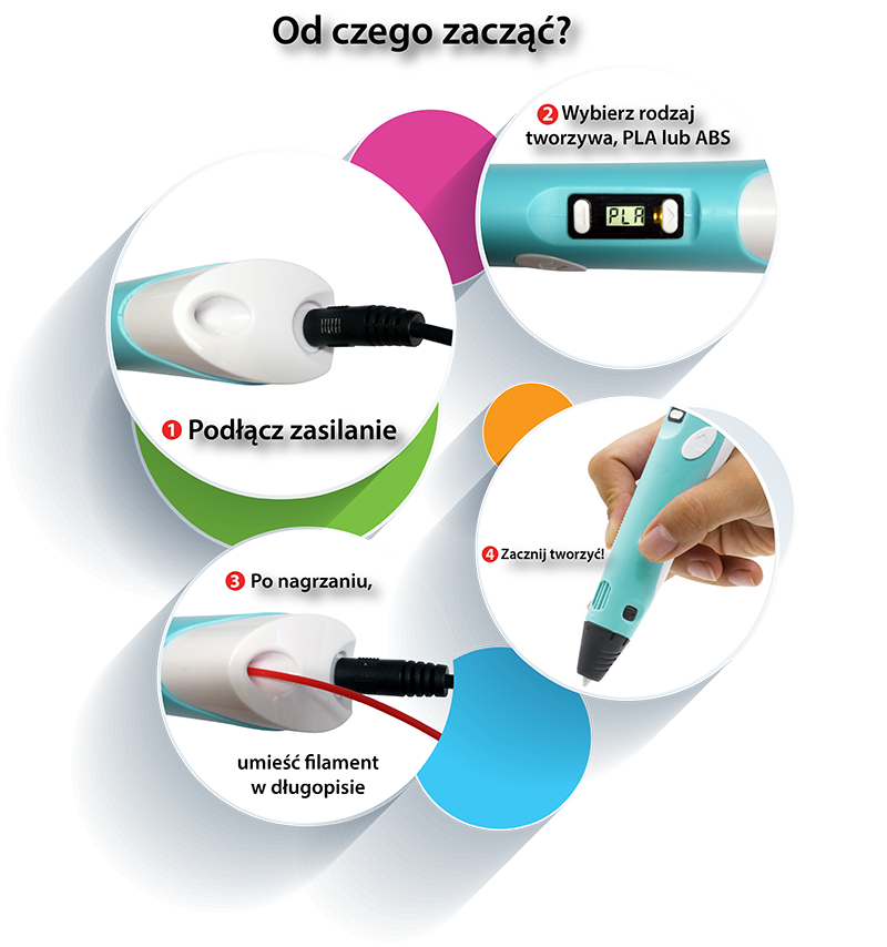 W zestawie znajduje się wszystko co potrzebne by rozpocząć przygodę: drukarka ręczna 3D, zasilacz, instrukcja w języku polskim i angielskim oraz zestaw startowy filamentu (tworzywa do druku) w 3 kolorach.
