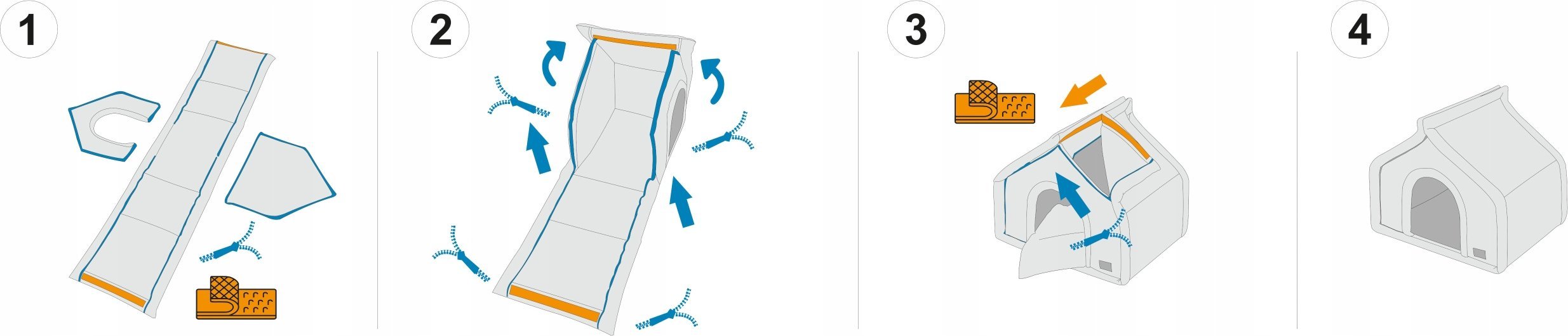 2. Należy złączyć suwakami podłogę z frontową ścianą i ścianą tylną. Suwaki zapina się tak samo ja w kurtkach.