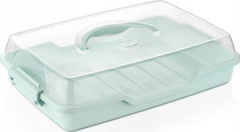 Pojemnik na ciasto miętowy z pokrywką Pojemnik na ciasto z pokrywką pozwoli Ci na sprawne i łatwe przenoszenie różnego rodzaju ciast i innych wypieków, gwarantując ich nienaruszony wygląd, smak oraz zapach. Został wykonany z najwyższej jakości tworzywa sztucznego, bezpiecznego w kontakcie z żywnością. Przezroczysta pokrywa pozwala na łatwy podgląd zawartości a solidne klipsy zagwarantują mocne i pewne zamknięcie. Poręczny uchwyt pozwoli na łatwe przenoszenie, nawet gdy pojemnik jest wypełniony po brzegi. Dzięki zgrabnemu wymiarowi nie sprawi kłopotu z przechowywaniem i z łatwością zmieści się w lodówce. Sprawdzi się do przenoszenia kanapek, drożdżówek, muffinek, pączków i różnego rodzaju ciastek. Parametry: Kolor: przezroczysty, odcienie zieleni (miętowy) Wysokość: 8 cm Długość: 34 cm Szerokość: 24 cm Materiał: tworzywo sztuczne