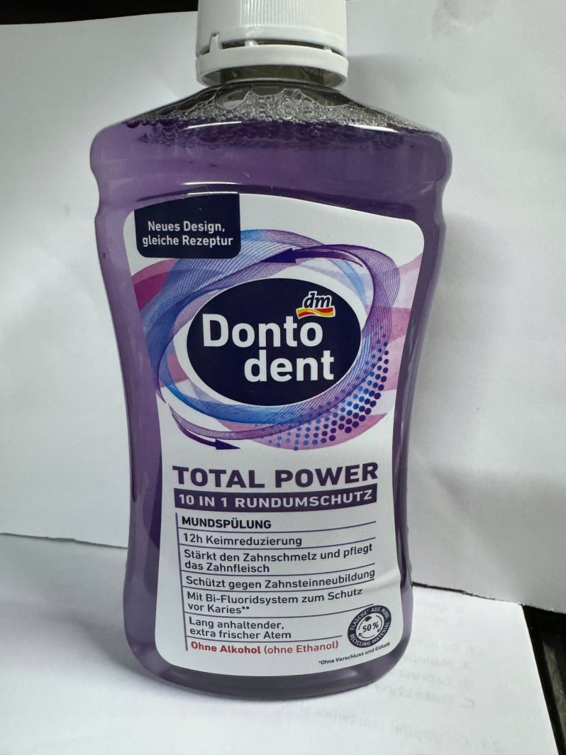 Dontodent Total Power wyróżnia się wyjątkową formułą 10 w 1, która oferuje szereg korzyści dla jamy ustnej. Produkt skutecznie redukuje zarazki przez 12 godzin, a także wzmacnia szkliwo zębów dzięki specjalnemu systemowi dwufluorkowemu. Płyn neutralizuje bakterie odpowiedzialne za nieświeży oddech, pozostawiając długotrwałe uczucie czystości i świeżości.