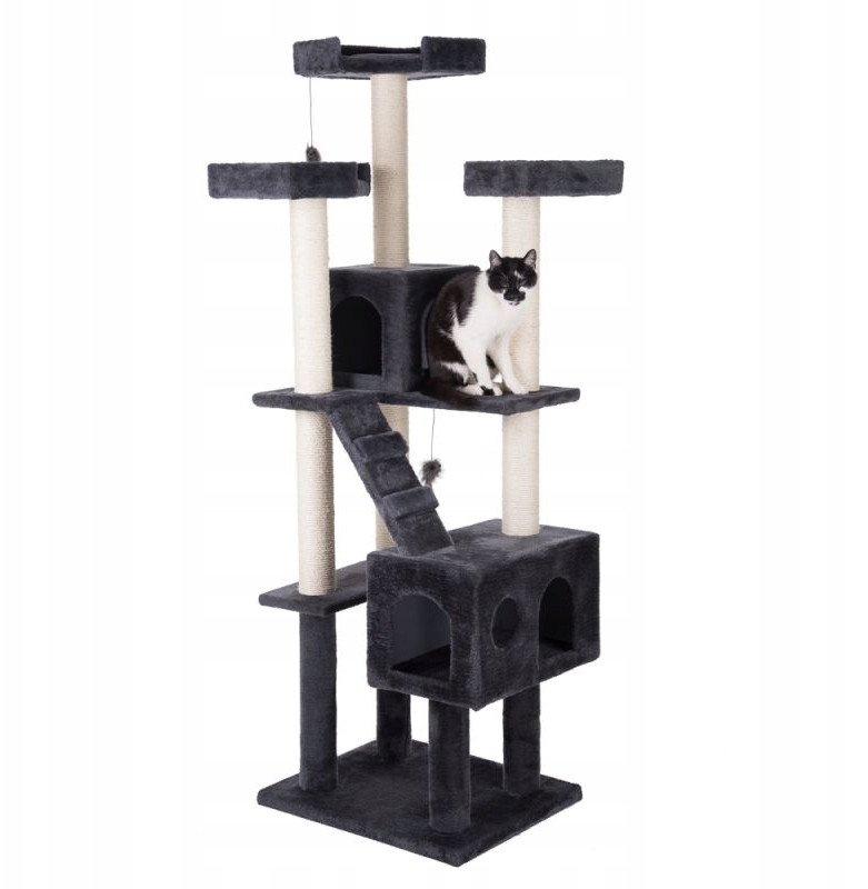 Piękny drapak z wieżami i schodami. Wyjątkowo wysokie, sizalowe słupki zapewniają dużo przestrzeni do szalonej zabawy i ostrzenia pazurów. Schody prowadzą do przytulnych jaskiń, które znajdują się na dwóch piętrach. Na trzech wieżach umieszczone są platformy widokowe.a dużych kotów, z dwoma platformami do spania. Drapak oferuje możliwość urozmaiconej zabawy i ostrzenia pazurów dla Twojego kota. Kolor: ciemnoszary