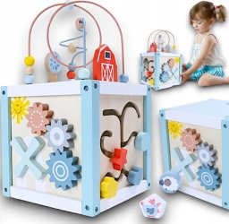 Kostka sensoryczna została wzbogacona o obrotowe koła zębate oraz zegar z ruchomymi wskazówkami, co sprawia, że zabawa staje się jeszcze bardziej wciągająca. Ruchome elementy, takie jak labirynt z kolorowymi koralikami, stanowią ekscytujące wyzwanie, które rozwija zdolności poznawcze dzieci, zachęcając je do odkrywania i eksperymentowania.