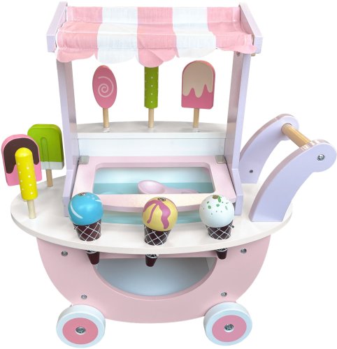 Wózek ma wysokość 44 cm, szerokość 41 cm i głębokość 19 cm, co czyni go idealnym do zabawy w domu. Wykonany z drewna, zapewnia trwałość i stabilność. Ciche kółka umożliwiają łatwe poruszanie się z wózkiem, a materiał zadaszający chroni lody przed słońcem. Dzięki przestronnemu schowkowi w dolnej części, dzieci mogą przechowywać swoje akcesoria w porządku.