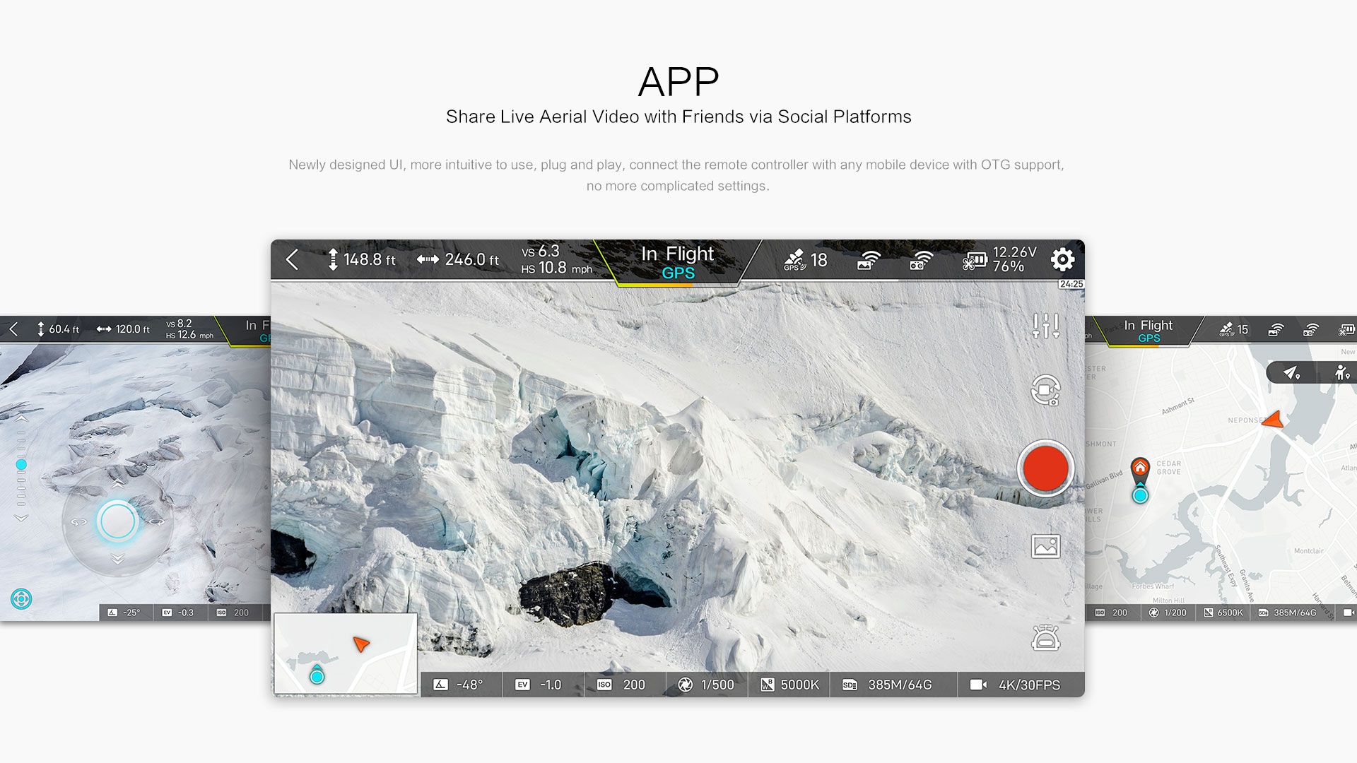 Dron jest wyposażony w Aparat 12 MP, ma czujnik Sony IMX378 1 / 2,6 z potrójnym zoomem cyfrowym. Robi profesjonalne zdjęcia w 4K o rozdzielczości do 4000 3000 pikseli! Aparat posiada funkcję robienia zdjęć panoramicznych, których jakości nie powstydziłyby się najnowsze lustrzanki cyfrowe. Dostarczany Gimbal jest obrotowy w trzech osiach mechanicznych, co sprawia że filmowanie jest naprawdę komfortowe.