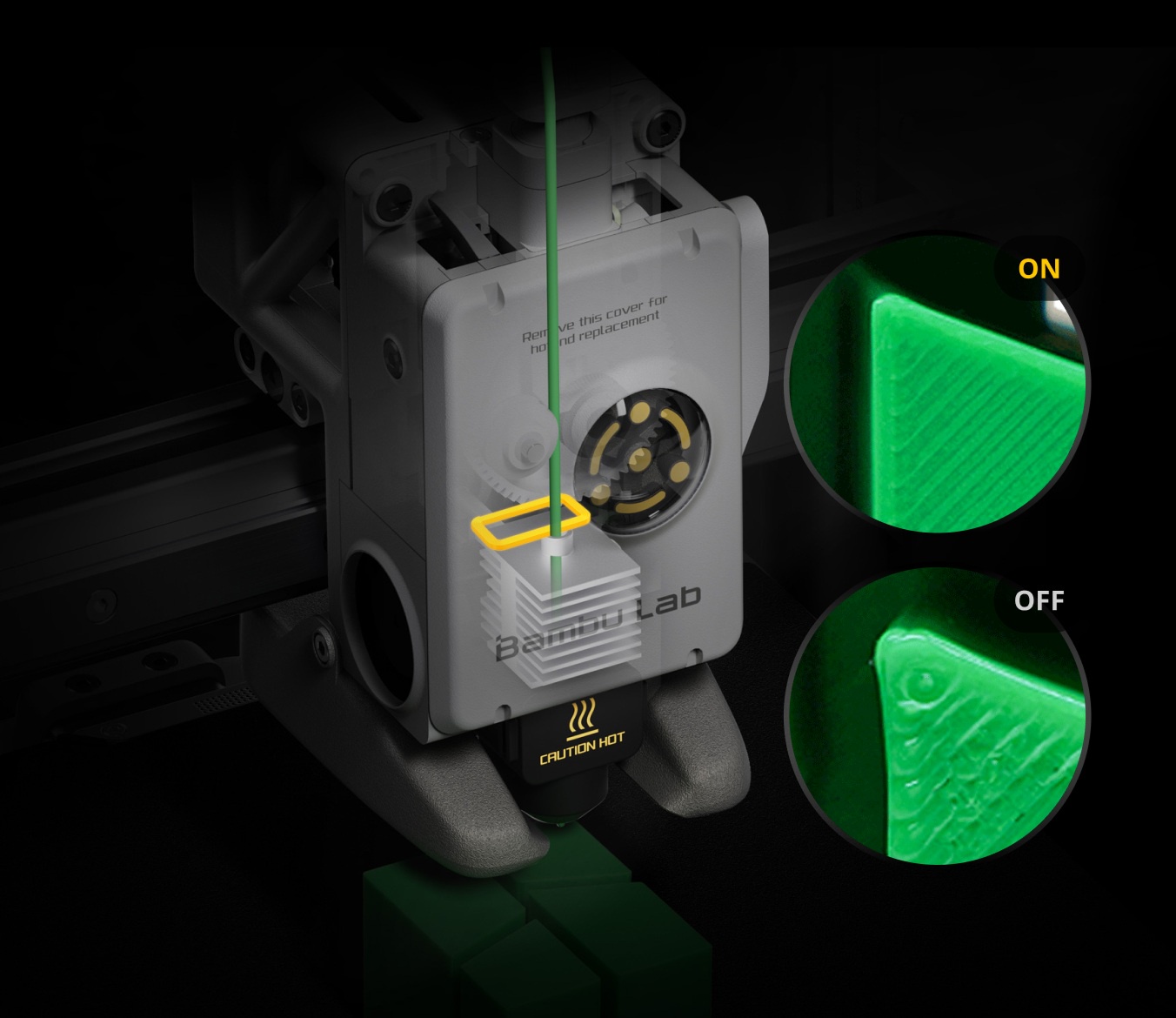 W głowicy narzędziowej zastosowano czujnik prądu wirowego o wysokiej rozdzielczości, który mierzy ciśnienie w dyszy w czasie rzeczywistym. Algorytm aktywnej kompensacji przepływu (Active Flow Rate Compensation) przewiduje i koryguje ilość wytłaczanego plastiku, co zapobiega powstawaniu zgrubień na narożnikach i zapewnia wysoką precyzję wymiarową modelu, niezależnie od zmian prędkości druku.