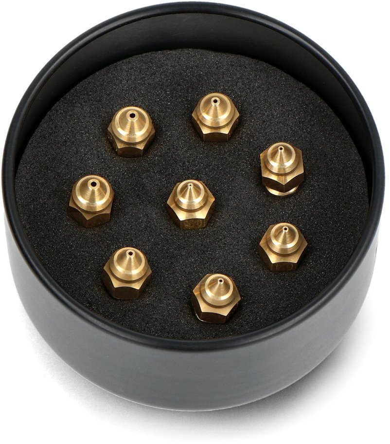 W zestawie znajdują się dysze o różnych średnicach: 0,25 mm (1 sztuka), 0,4 mm (3 sztuki), 0,6 mm (2 sztuki) oraz 0,8 mm (2 sztuki). Taki dobór dysz pozwala na elastyczne dostosowanie się do potrzeb każdego projektu, co czyni ten zestaw niezwykle praktycznym.