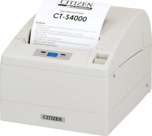 Citizen CT-S4000. Technologia druku: Termiczny, Model: Drukarka POS, Maksymalna rozdzielczość: 203 x 203 DPI. Maksymalna średnica rolki: 10,2 cm, Obsługuje szerokość papieru: 112, 82.5, 80 mm. Technologia łączności: Przewodowa. Wbudowane kody kreskowe: CODABAR (NW-7), Code 39, Code 93, EAN13, EAN8, ITF, PDF417, UPC-A, UPC-E, Wytrzymałość Auto-cutter"a: 1 milionów cięć, Certyfikaty: UL, C-UL, FCC, TUV-GS, CE. Kolor produktu: Biały
