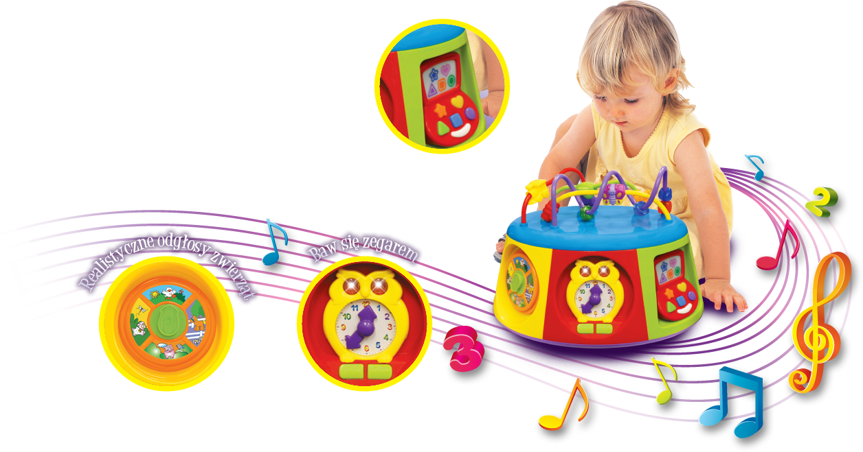 Wspaniałe, pełne niespodzianek pudełeczko dla najmłodszych. Zabawka posiada 7 różnych stron, a każda z nich to nowa, interesująca zabawa. Maluch naciskając na różne strony pudełeczka uruchamia melodyjki, dźwięki, światełka. Dziecko może wykręcić numer na mini telefonie, naciskać guziczki o różnych kształtach, przekręcić wskazówki zegara w kształcie sowy lub zagrać na mini pianinku. Aktywne pudełeczko zapewnia zabawę na wiele godzin. Rozwija, wyobraźnię, zdolności manualne oraz pobudza zmysł wzroku oraz słuchu.Zabawka przeznaczona dla dzieci od 12 m.