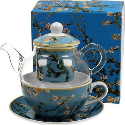 Szklany dzbanek z porcelanową filiżanką i spodkiem Almond Blossom by V. van Gogh wchodzące w skład serii Art Gallery. Dzbanuszek wykonany ze szkła hartowanego natomiast filiżanka, filtr oraz spodek wykonane z porcelany, która charakteryzuje się naturalnym kremowo-białym kolorem z delikatnym połyskiem oraz wyjątkową wytrzymałością i trwałością, zachowując lekkość i finezję. Linia wykonana z białej porcelany wewnątrz zdobionej reprodukcją obrazu van Gogh'a "Kwitnący Migdałowiec". Stonowana kolorystyka delikatnego błękitu oraz łagodnej bieli sprawia, że zastawa to harmonijne połączenie klasyki z nowoczesnością. Całość zapakowana w ozdobne pudełko dekorowane tym samym motywem to doskonały pomysł na niebanalny prezent urodzinowy zarówno dla kobiety i mężczyzny, a także podarunek dla szefa czy nauczyciela, również jako podziękowanie. Obraz "Kwitnący migdałowiec" z 1890 roku ręki Vincenta van Gogh'a jest jednym z bardziej cenionych przez autora, ze wzgledu na jego rodzinny charakter. Artysta namalował dzieło dla swojego nowo narodzonego bratanka, nazwanego na jego cześć imieniem Vincent. Wzór na obrazie jest także odzwierciedleniem fascynacji van Gogh'a sztuką japońską.