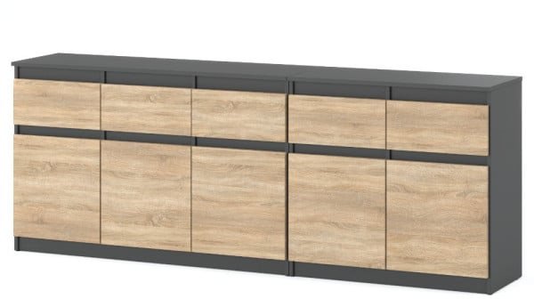 Ta imponująca komoda została wyposażona w pięć pojemnych szuflad oraz cztery półki, co zapewnia wystarczająco dużo miejsca na odzież, dokumenty oraz inne niezbędne akcesoria. Nowoczesny design, który łączy szary matowy korpus z frontem w kolorze dębu Sonoma, sprawia, że komoda jest nie tylko funkcjonalna, ale również stylowa.