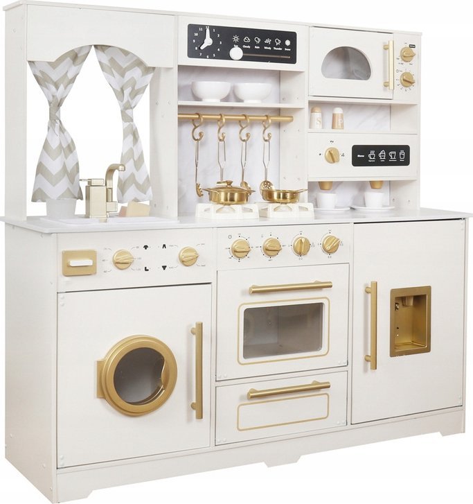 Ta przestronna kuchnia drewniana w stylu glamour, ozdobiona złotymi akcentami, to elegancka zabawka, która harmonijnie łączy estetykę z funkcjonalnością. Stworzona z myślą o małych kucharzach, oferuje realistyczne elementy, takie jak otwierane drzwiczki, ruchome pokrętła oraz palniki, które wydają dźwięki gotowania. To doskonały wybór dla dzieci pragnących naśladować dorosłych w kuchni.