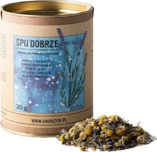 Herbata sypana "Dworzysk - Dobrego Dnia" to niezwykła mieszanka ziołowa, która wspomaga zdrowy sen oraz relaks. Dzięki starannie dobranym składnikom, takim jak lawenda, rumianek, melisa, chmiel i wrzos, ta herbata działa uspokajająco, wspierając regulację układu nerwowego i trawiennego. Idealna do spożycia przed snem, przynosi ukojenie i łagodzi stany lękowe.