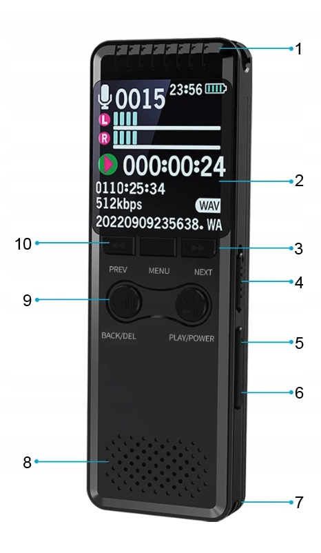 12. Smycz: Możliwość zawieszenia dyktafonu na smyczy, ułatwiająca przenoszenie.