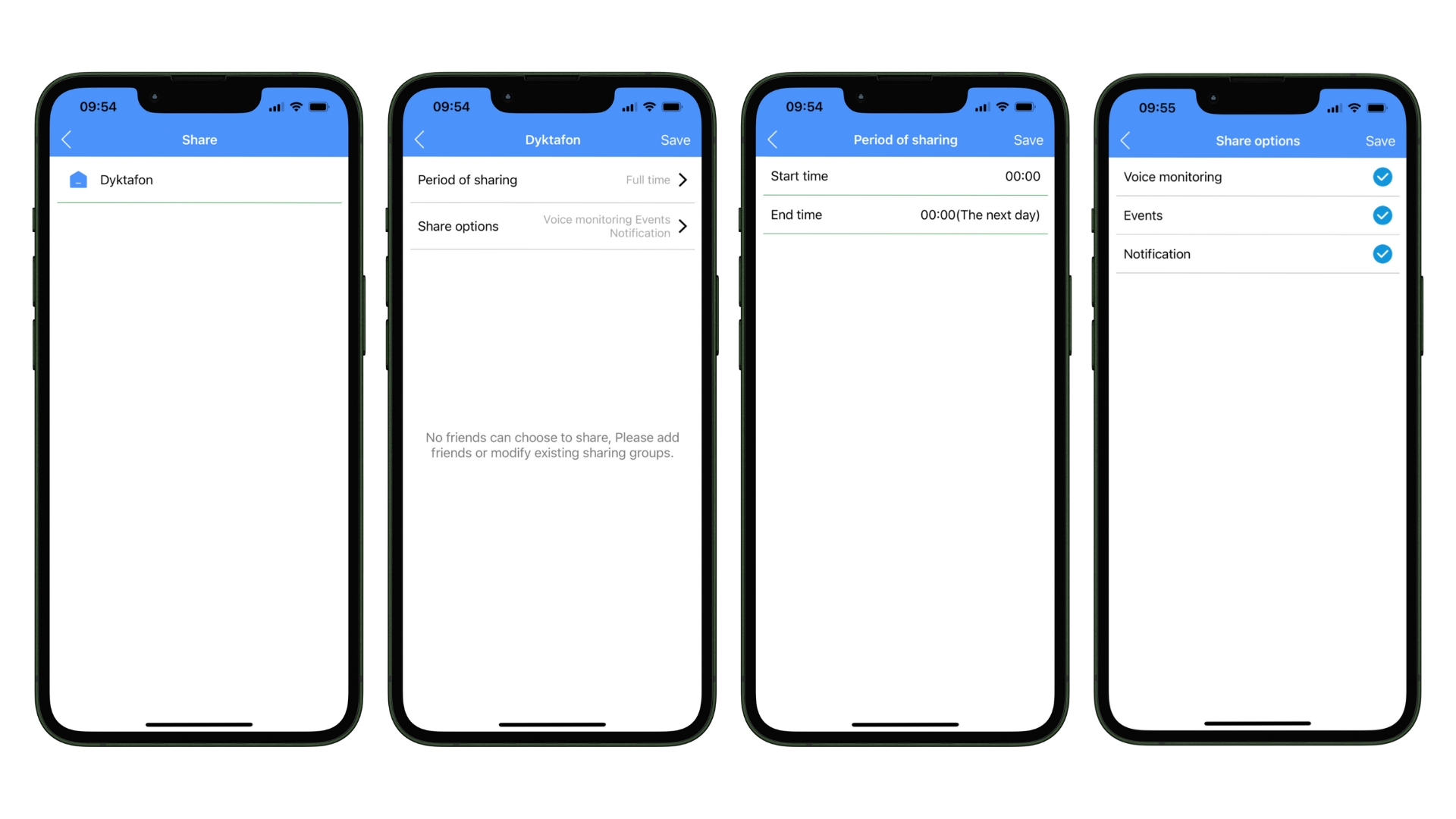 10. Możliwość udostępniania nagrań i urządzenia: Dyktafon oferuje funkcję udostępniania nagrań innym użytkownikom. Możesz precyzyjnie określić, które dane mają być dostępne (monitoring głosowy, powiadomienia, zdarzenia), a także ustawić okres, w którym nagrania będą udostępniane.
