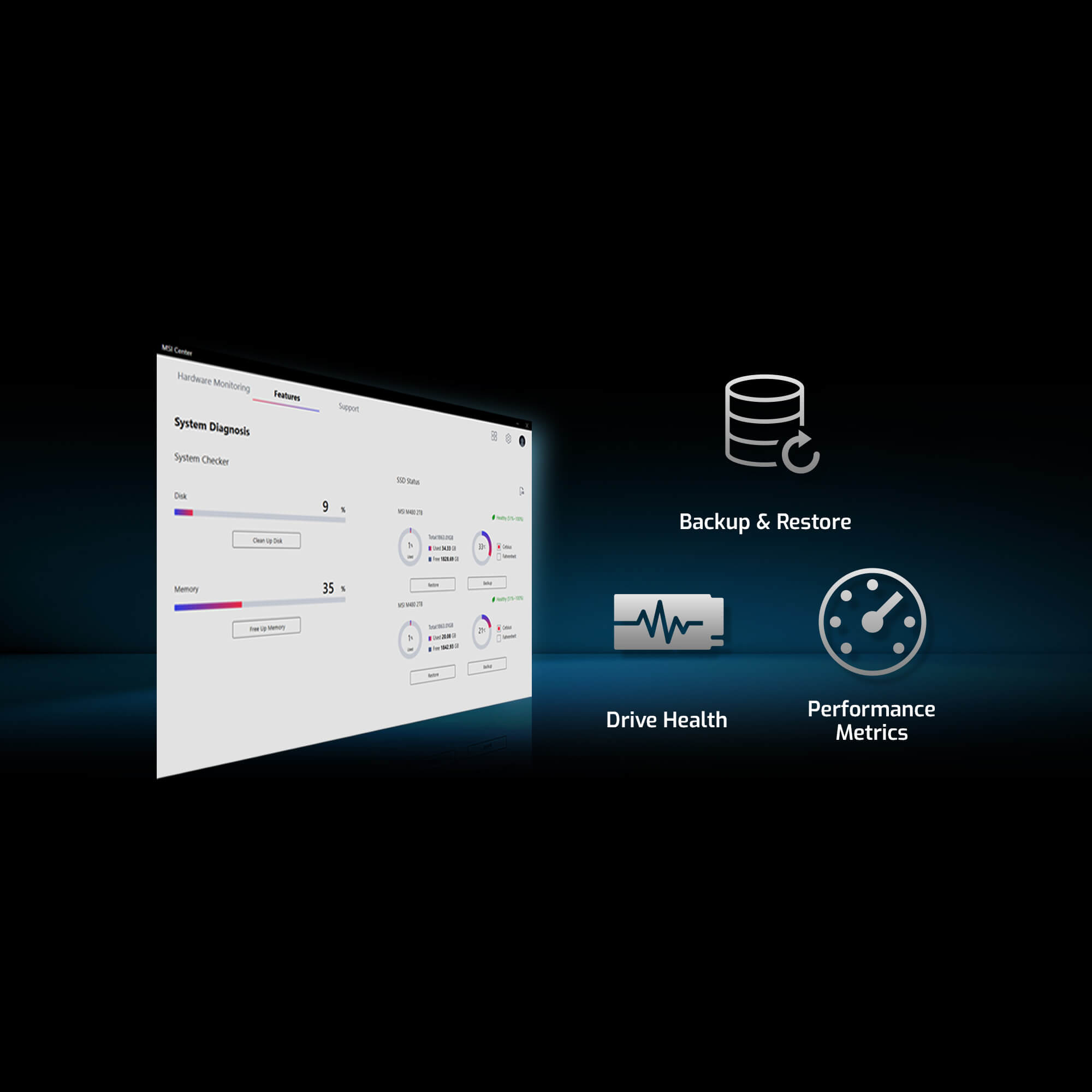 Przenoś dane oraz monitoruj stan dysku i parametry wydajności w czasie rzeczywistym za pomocą aplikacji MSI Center.