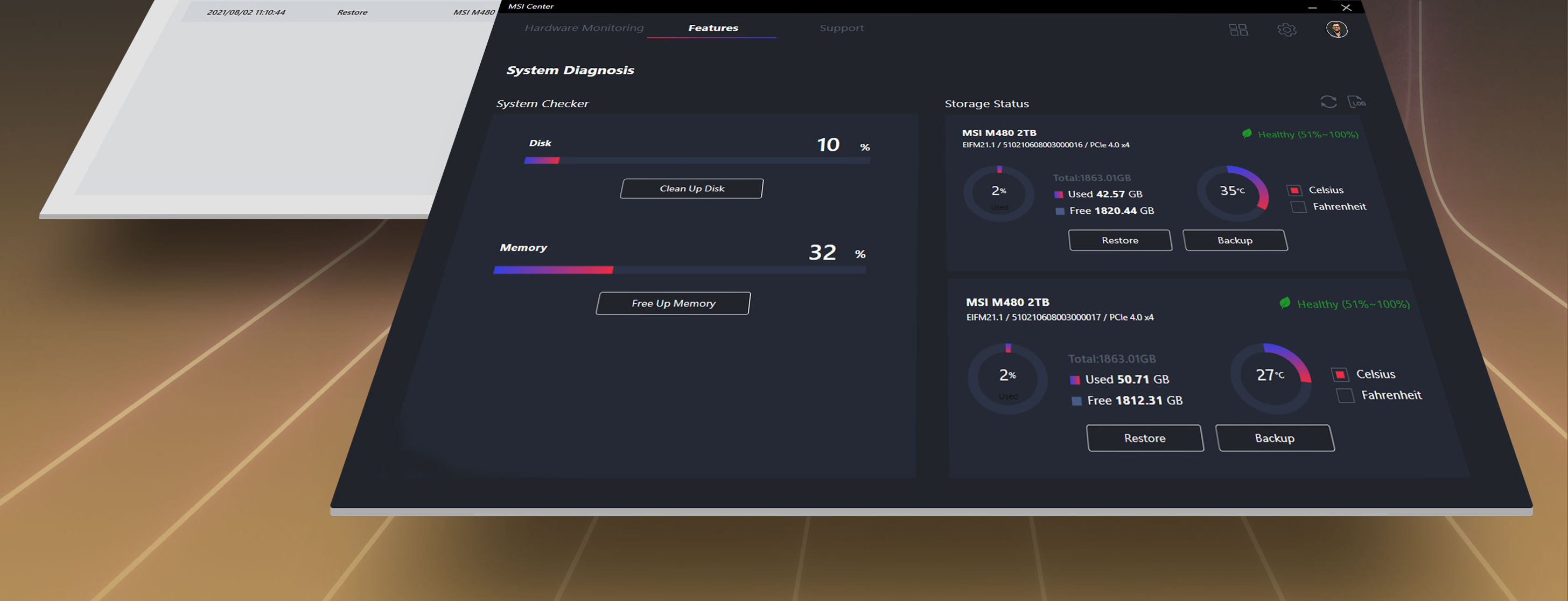 Przenoś swoje dane, monitoruj stan napędów i wydajność dysków w czasie rzeczywistym za pomocą aplikacji MSI Center. Dzięki programowemu rozwiązaniu firmy Actiphy, które oferuje funkcje tworzenia kopii zapasowych i przywracania danych możesz zapobiec utracie cennych plików i informacji.