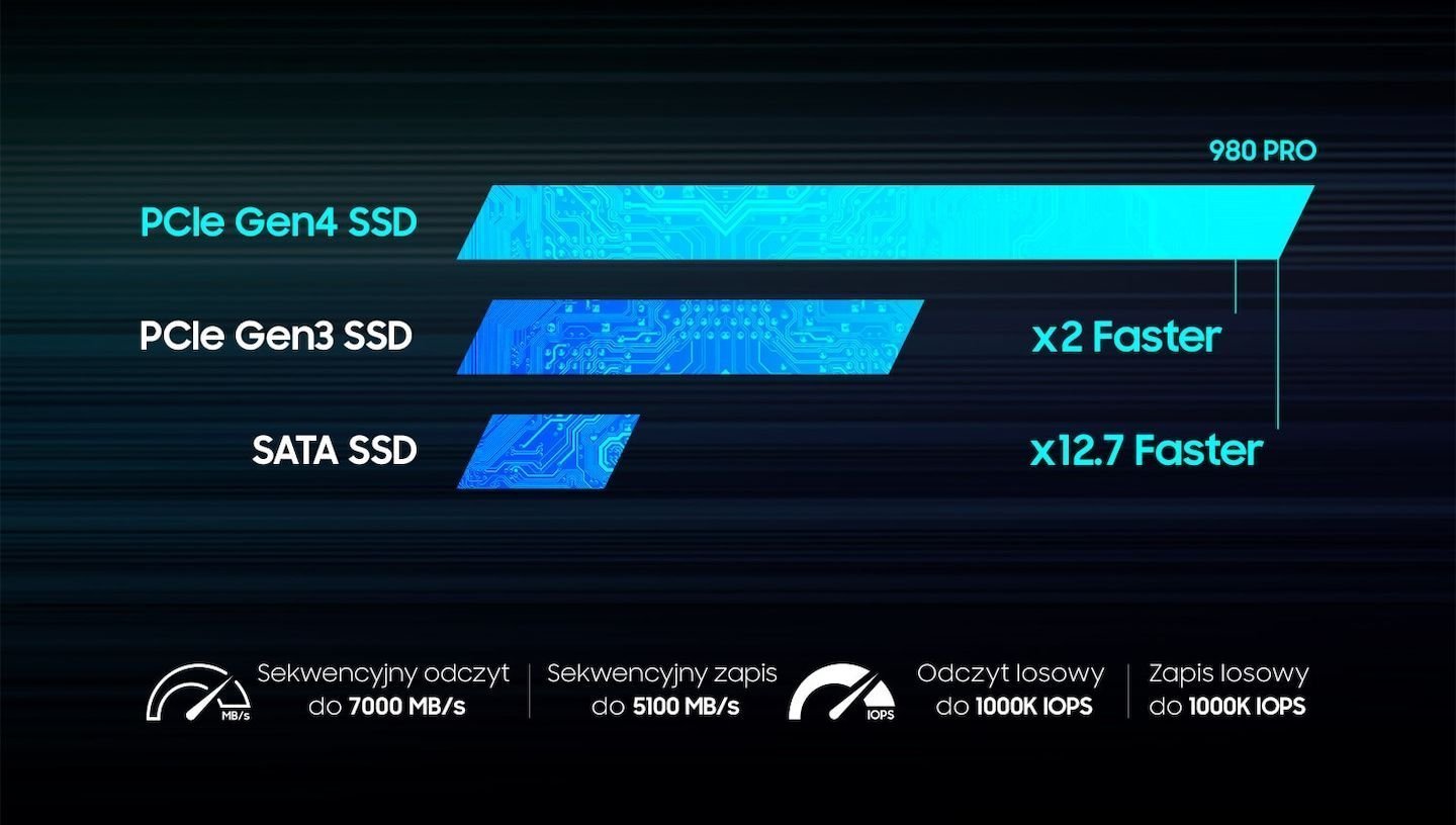 Napędzany opracowanym przez Samsung kontrolerem Elpis dla SSD PCIe 4.0 dysk 980 PRO zoptymalizowano pod kątem szybkości działania. Oferuje prędkość odczytu do 7000 MB/s, jest zatem 2x szybszy od dysków SSD PCIe 3.0 i 12,7x szybszy niż dyski SSD SATA. 980 PRO osiąga maksymalne prędkości w przypadku PCIe 4.0.