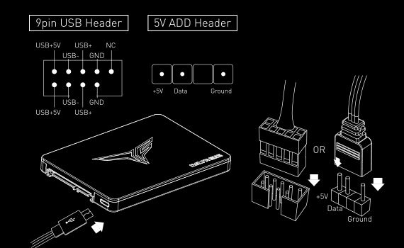 Istnieją dwa sposoby kontrolowania efektu świetlnego DELTA MAX RGB SSD. Zgodnie z odpowiednim źródłem sterowania światłem dla każdego trybu można zastosować tylko jeden rodzaj kabla • Tryb synchronizacji wykorzystuje 3 V ARGB 3 pin do kabla Micro B. Użyj 3-stykowego złącza ARGB 3 V do kabla Micro B, podłącz DELTA MAX • Początkowy efekt świetlny Rainbow wykorzystuje kabel USB 10 Pin do Micro B. Użyj 10-pinowego złącza USB do kabla Micro B, podłącz DELTA MAX (9-pinowe złącze MB)