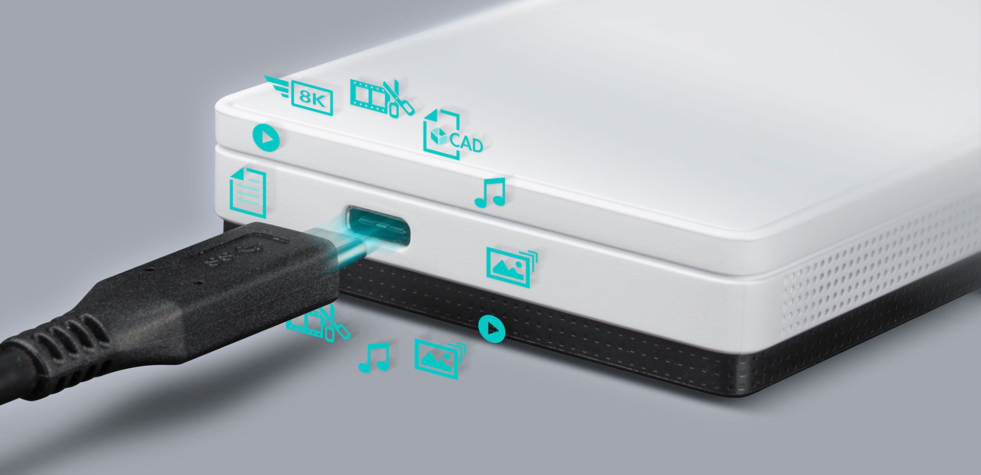 Uniwersalny interfejs USB-C zapewni najwyższy komfort podczas użytkowania dysku zewnętrznego. Z łatwością podłączysz go do komputera lub innego urządzenia. Port USB-C jest płaski i niewielki, dlatego też dysk ten wyróżnia się kompaktową obudową.