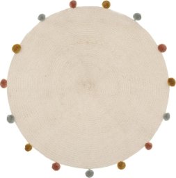 Beżowy, okrągły dywanik do dziecięcego pokoju został wykonany z bawełny. Ozdobiony jest pomponikami, które nadają mu lekkości. Będzie idealną ozdobą przed łóżeczkiem dziecka.