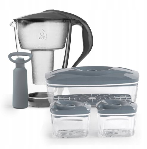 W skład zestawu wchodzi nie tylko szklany dzbanek, ale także jeden filtr Classic Standard, dwa pojemniki próżniowe o pojemności 0,5 l oraz jeden pojemnik próżniowy o pojemności 1,5 l, a także manualna pompka próżniowa. To kompleksowe rozwiązanie, które zaspokoi wszystkie Twoje potrzeby związane z filtracją i przechowywaniem napojów.