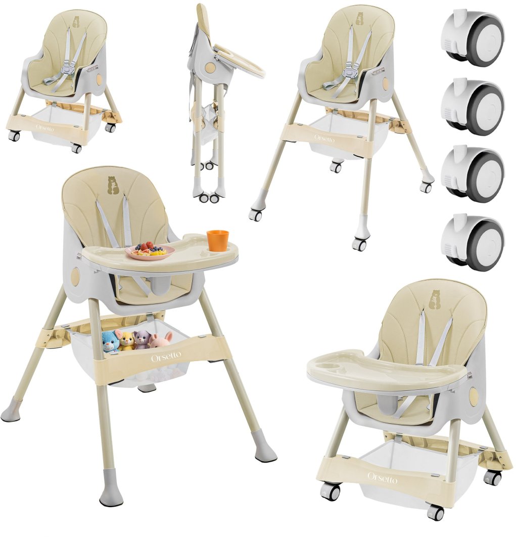 Krzesełko do karmienia 4w1 Orsetto Karmelk w odcieniach brązu i beżu to znakomity wybór dla rodziców, którzy pragną zapewnić swojemu dziecku komfort oraz bezpieczeństwo podczas posiłków. Dzięki swojej wszechstronności, krzesełko dostosowuje się do potrzeb rosnącego malucha, oferując cztery różne konfiguracje, które ułatwiają codzienne karmienie.