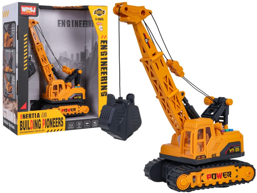 Dźwig wyposażony jest w przyciski na dachu, które uruchamiają efekty dźwiękowe, takie jak wesołe melodie oraz odgłosy pracy maszyny. Dodatkowo, efekty świetlne w postaci mrugających światełek wzbogacają zabawę, angażując zmysły dzieci i pobudzając ich wyobraźnię. Dzięki temu każda chwila spędzona z dźwigiem staje się niezapomniana.